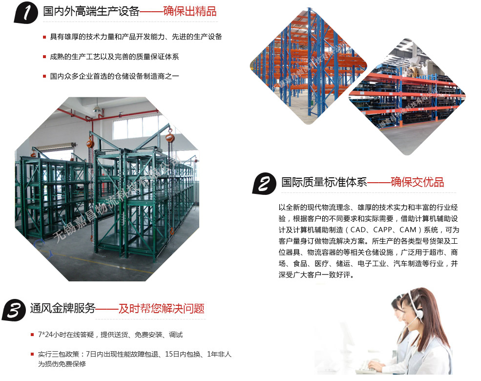 無錫嘉昌倉儲貨架有限公司主要產(chǎn)品有:鉚釘貨架、角鋼貨架、中型貨架、重型貨架、懸臂式貨架、流利式貨架、重力式貨架、壓入式貨架、模具架、閣樓貨架、鋼平臺、密集架、線棒架、自動化立體倉庫貨架以及周邊配套設(shè)施(托盤、周轉(zhuǎn)箱、倉儲籠、堆垛架、物流臺車、零件盒、工具車、工具柜、工作桌、文件柜、更衣柜、小推車、輥道輸送線、網(wǎng)片隔斷、液壓升降平臺以及液壓搬運(yùn)車等)。